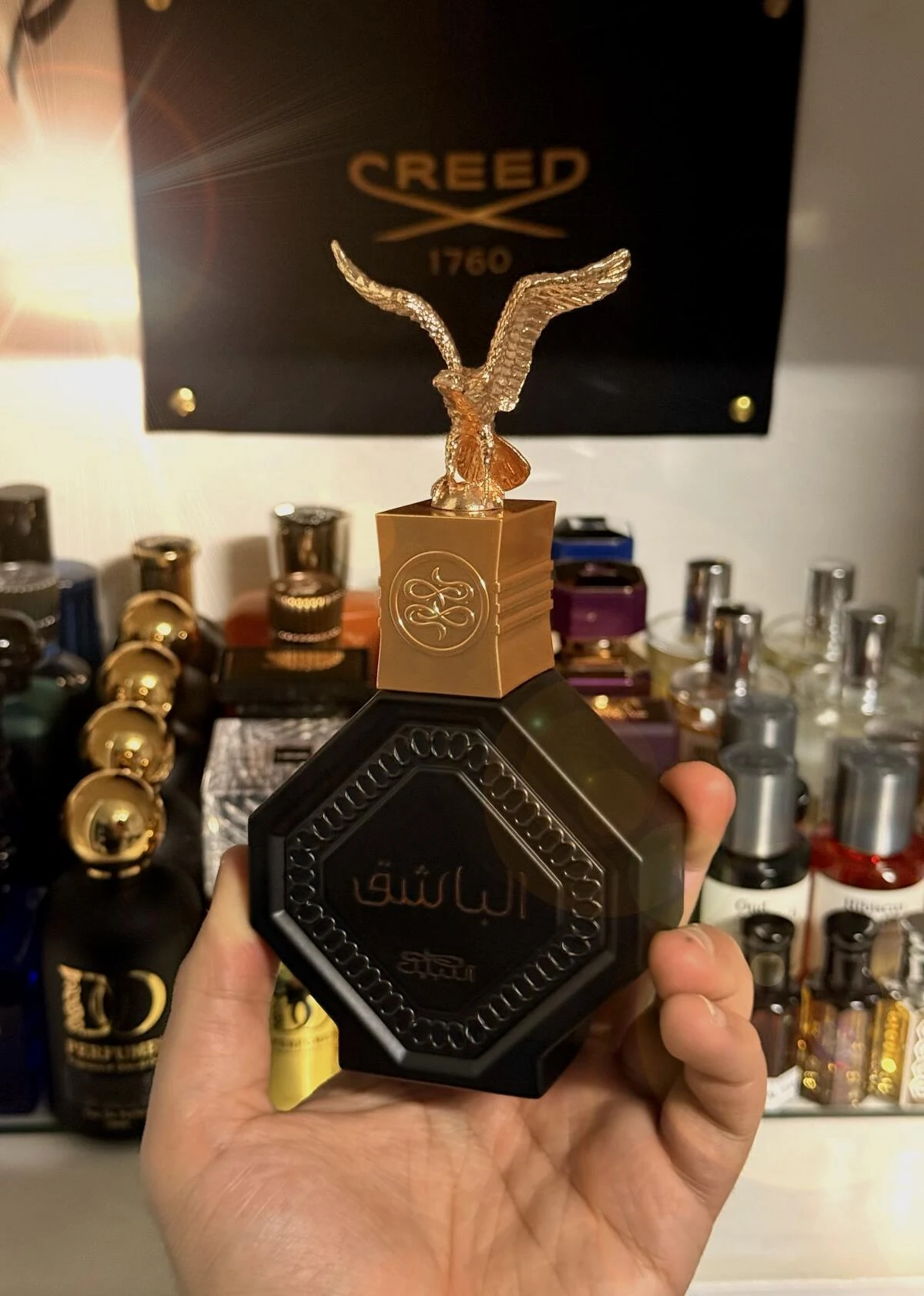 • This Perfumaso deserves this lovely Arabic poem: In majestic flight atop the burning desert, where the sun kisses the golden sand, the falcon rises, proud and brave, with wings that cut the sacred breeze. Its gaze, a flash of fire, observes the world with ancient wisdom. Carrier of dreams, fearless hunter, in its free flight, freedom shines. With the wind as a faithful ally, it traces paths in blue skies. An eternal symbol, a king without a laurel, in the dance of the air, whispers and lights. Oh, noble falcon, untamed spirit, you rise above lands of history and passion. In every beat, in every instant, you guard the echo of our tradition.