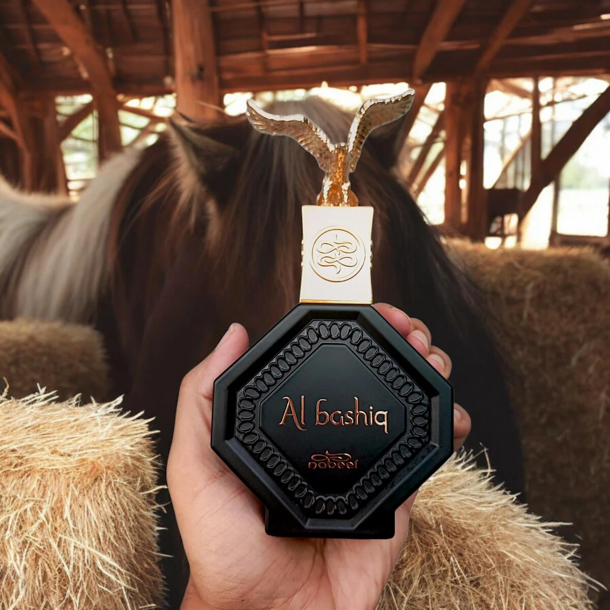 Al Bashiq by Nabeel is a leather fragrance for men and women. Launched in 2022, this composition features top notes of leather, incense, cypress, styrax, saffron, cardamom, lavender, hyssop, pine, cinnamon, bitter almond, fruity notes, nutmeg, apple, grapefruit and bergamot. The heart reveals oud wood, myrrh, earthy notes, balsamic notes, cypress, guaiac wood, frankincense, labdanum, cedar, geranium, cashmere, jasmine and valley lily. The base notes settle on oud wood, tobacco, guaiac wood, vetiver, amber, balsam of Peru, saffron, benzoin, patchouli, sweet notes, ambergris, sandalwood, vanilla, musk and tonka bean.