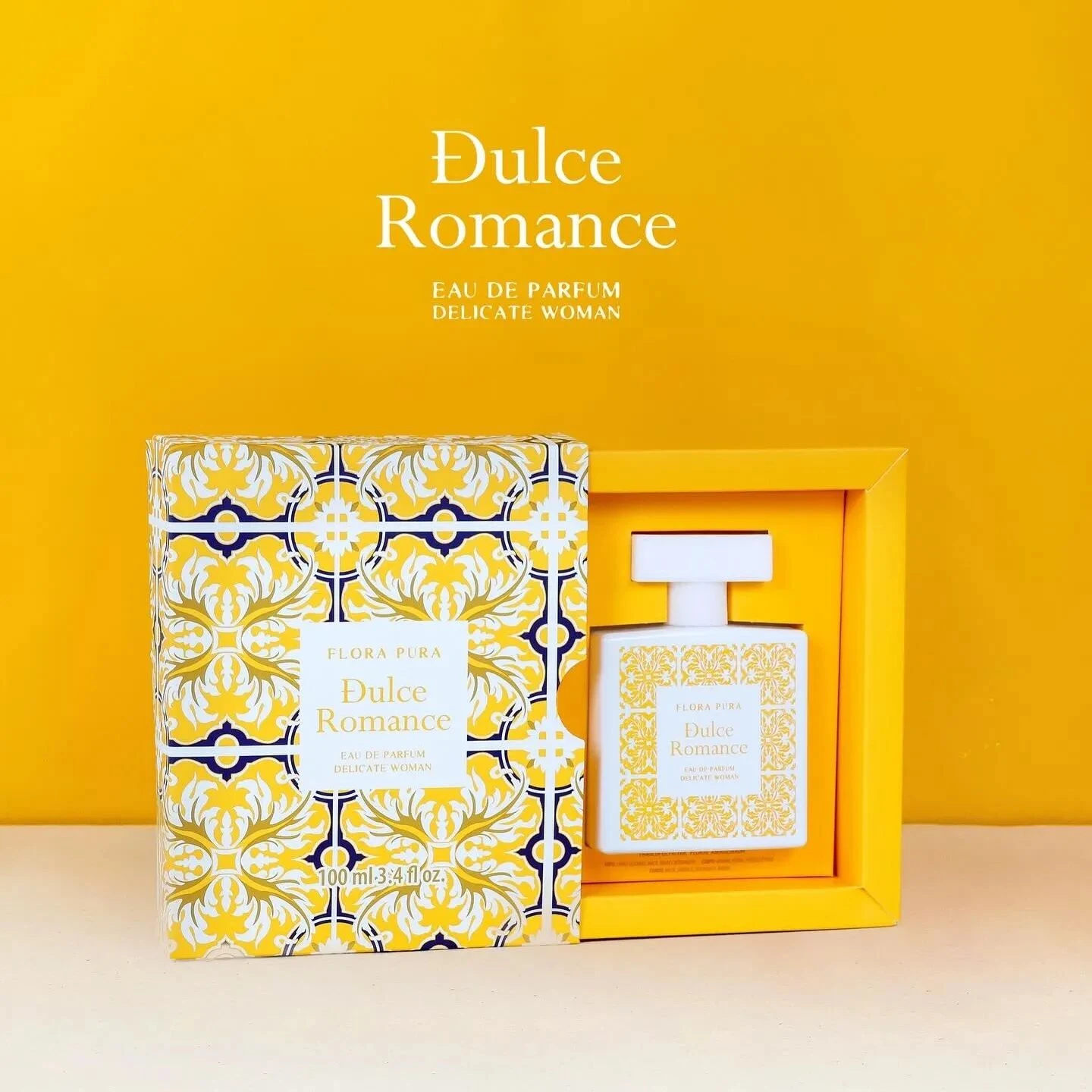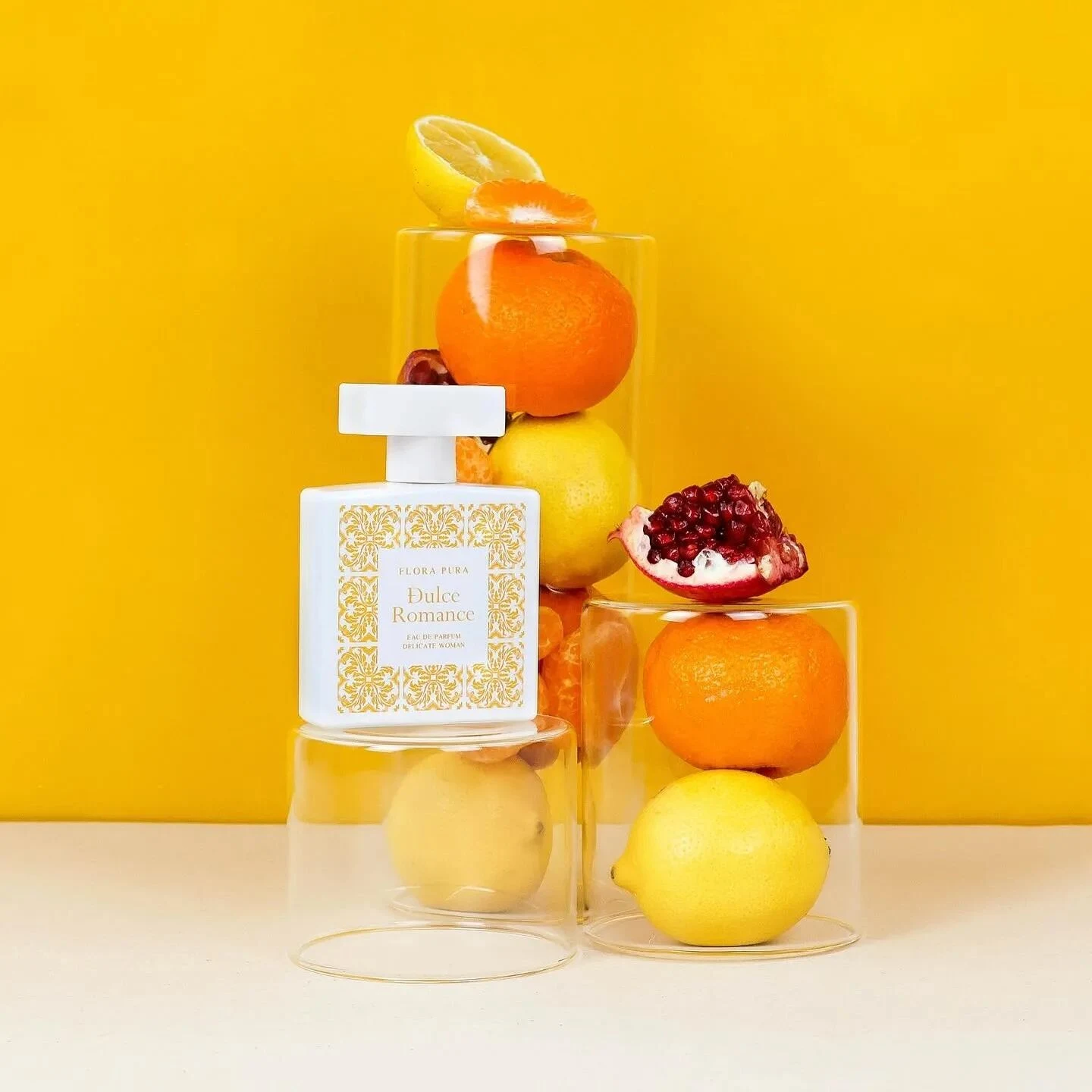 Dulce Romance by Flora Pura is a floral fragrance for women. This creation, launched in 2024, unfolds an olfactive pyramid where the top notes combine the freshness of pomegranate, bergamot and lemon (sour lime). The heart of the composition reveals the sweetness of peach interwoven with jasmine, peony and rose, while the base notes provide warmth and persistence thanks to musk, amber, sandalwood and patchouli.