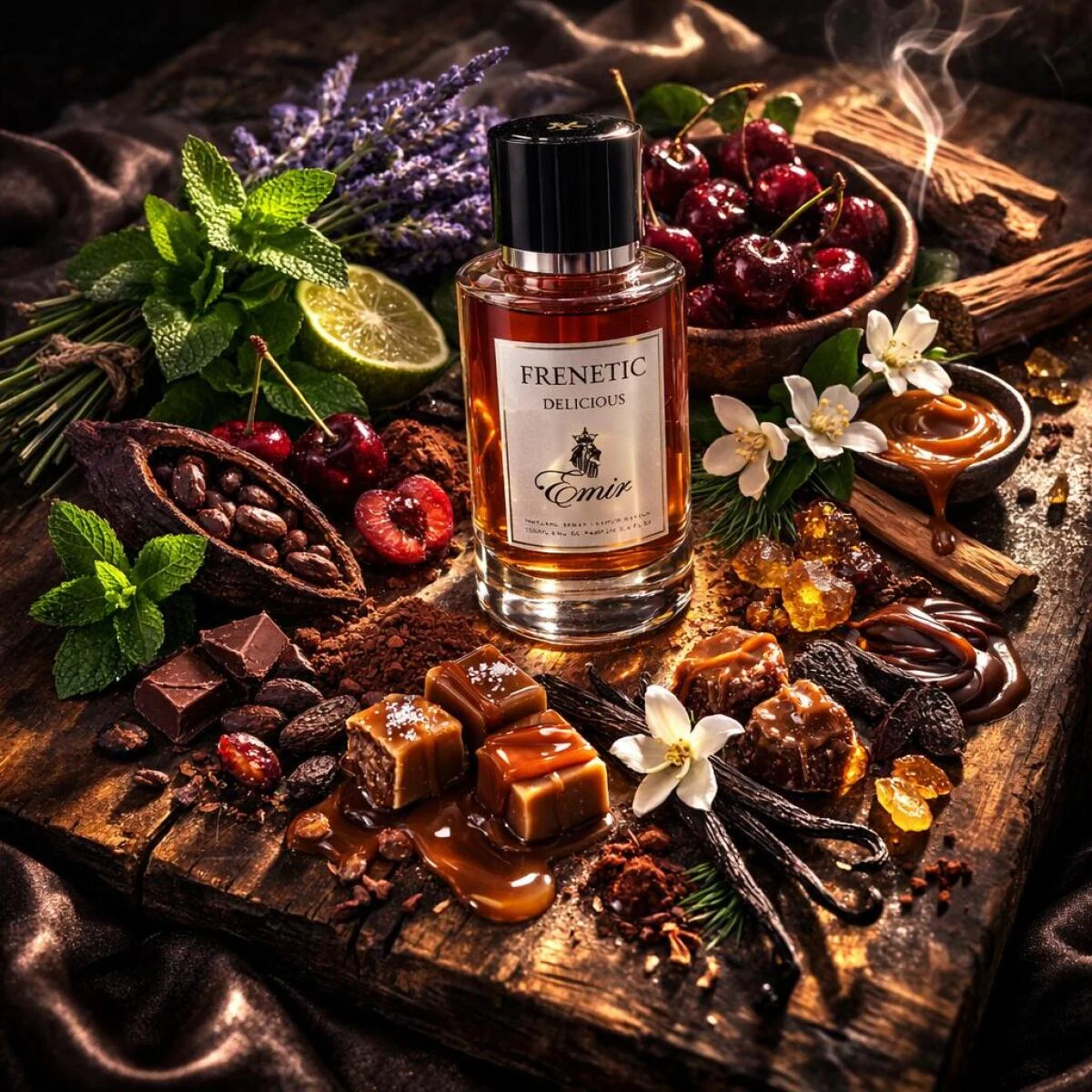 Emir Frenetic Delicieuse by PARIS CORNER is an oriental vanilla fragrance for men and women. Launched in 2021, this composition features lavender, mint and bergamot in the top notes; sour cherry (morello), freesia and jasmine in the heart; and tonka bean, praline, caramel, vanilla, benzoin, cedar, sandalwood, cocoa pod, milk and leather in the base.