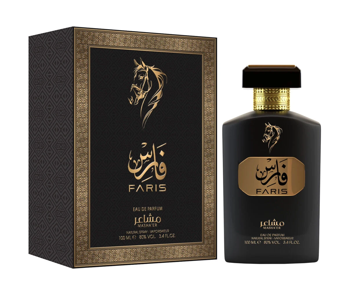 Faris by Mashaer is an oriental fragrance for men. Launched in 2024, this composition features an olfactory pyramid that begins with top notes of saffron, ginger, and oud wood. The heart of the fragrance unfolds a bouquet of carnation and cyclamen, also known as Persian violet. To finish, the base notes reveal a warm and persistent accord formed by sandalwood, tonka bean, cedar, ambergris, leather, musk, oud wood, and vanilla.