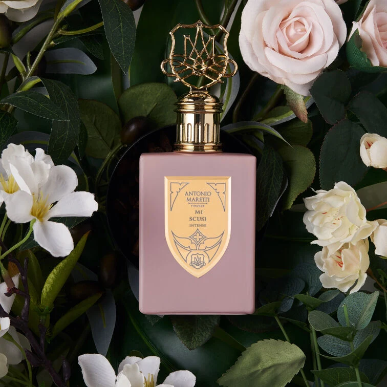 MI SCUSI INTENSE by Antonio Maretti is a floral fruity gourmand fragrance for women. This creation, launched in 2024, unfolds an olfactory pyramid where the top notes evoke the freshness of peach, melon and lemon; the floral heart is built around orange blossom, raspberry and rose; while the base notes add warmth and longevity with praline, musk and moss.