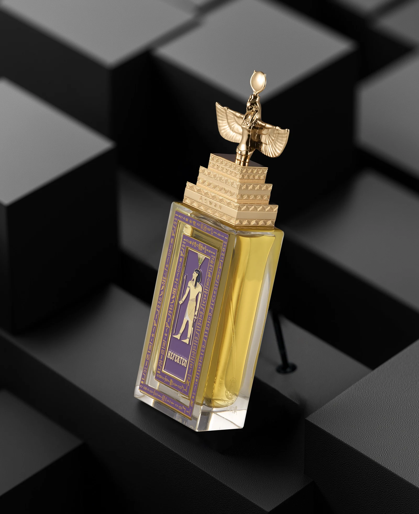 Nefertem by Aswan is a floral fruity fragrance for men and women. This creation, launched in 2025, is a new addition to the brand's collection. The nose behind this composition is Ibrahim Al Zoabi. The top notes unfold with pear blossom, magnolia, blackberry, rhubarb, and truffle; the heart reveals peony, jasmine tea, and violet leaves; while the base notes settle on heliotrope, vanilla orchid, and guaiac wood.