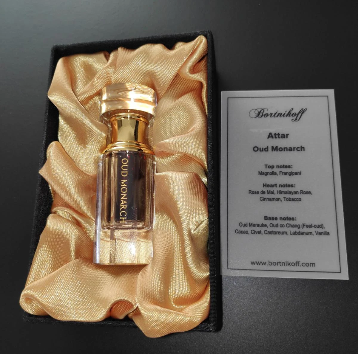 Bortnikoff's Oud Monarch Attar is an oriental floral fragrance for men and women. Launched in 2020, the nose behind this composition is Dmitry Bortnikoff. The top notes are frangipani (plumeria, plumaria, atapaima) and magnolia; the heart notes, may rose, rose, cinnamon and tobacco; and the base notes, cacao, oud wood, castoreum, vanilla, algalia (civet) and labdanum.