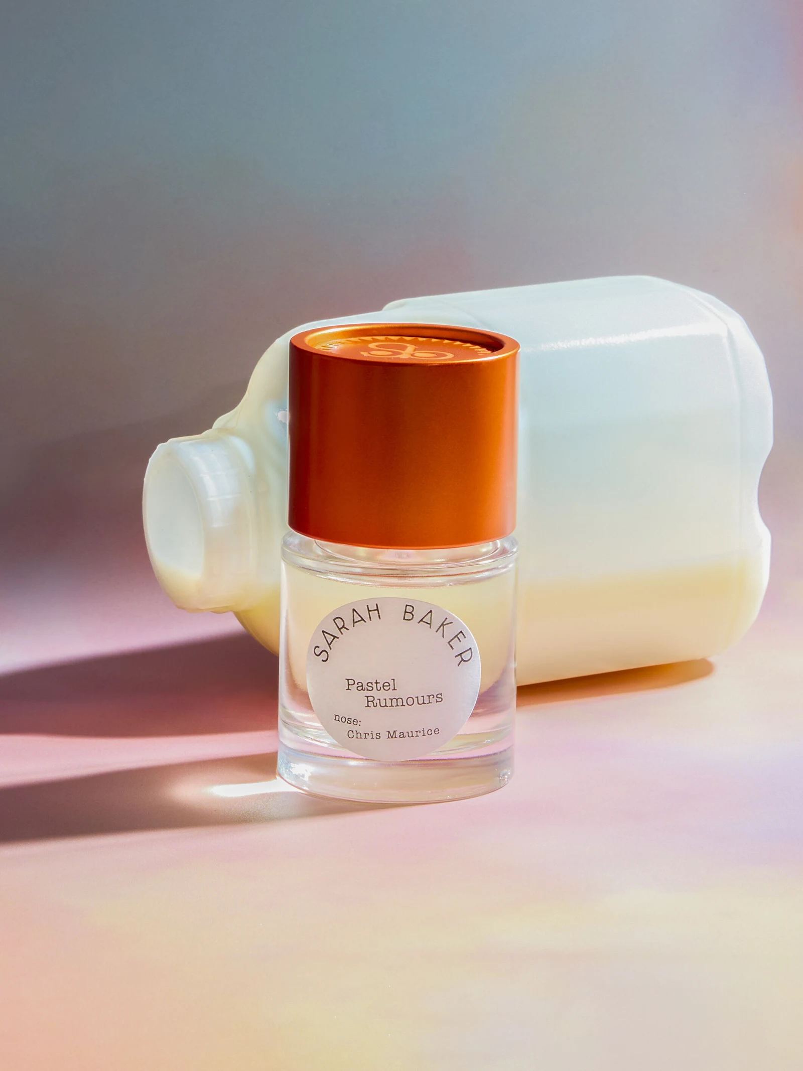 Pastel Rumours by Sarah Baker Perfumes is an oriental vanilla creation from the olfactory family, designed for men and women. This fragrance, signed by perfumer Chris Maurice, was launched in 2024. Its olfactory pyramid unfolds with top notes of peach, milk, cereals, ginger, and cardamomo; heart notes of custard, caramel, and iris root; and a base of vanilla and musk.