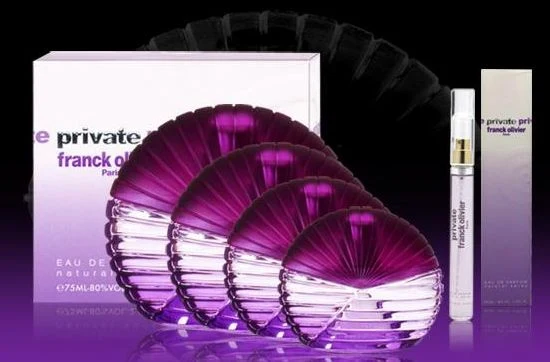Private by Franck Olivier is a fruity floral fragrance for women. Launched in 2005, this composition features top notes of blackcurrant, melon, dried fruits, red apple and tangerine orange; heart notes of lily of the valley, rose, sandalwood, jasmine and clove; and base notes of sea water, oakmoss and musk.