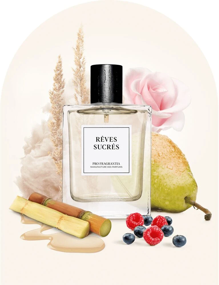 Rêves Sucrés by Pro Fragrantia is a fragrance from the olfactive family for men and women. Launched in 2024, this composition is signed by perfumer Thomas Nipkow. The top notes unfold a vibrant fruity accord featuring rhubarb, melon, peach, and plum; the heart reveals a sweet and wild floral bouquet thanks to pear, blueberries, raspberry, and rose; while the base anchors the fragrance with a warm and enveloping blend of musk, sugar, vanilla, and amber.